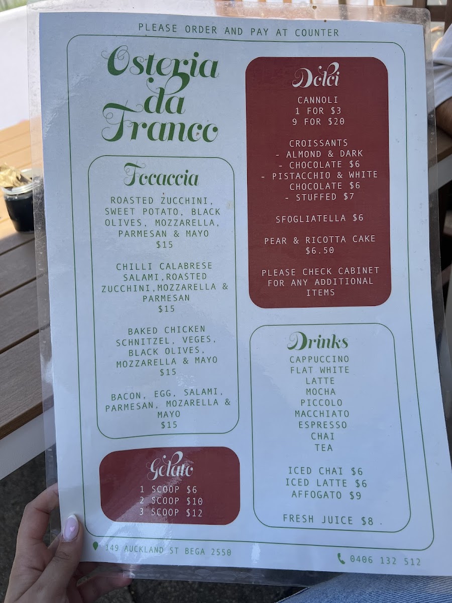 The menu at Osteria Da Franco features a variety of Italian café offerings suitable for breakfast, coffee breaks, and light meals. It includes a selection of hot and cold drinks alongside a range of traditional Italian pastries and baked goods.